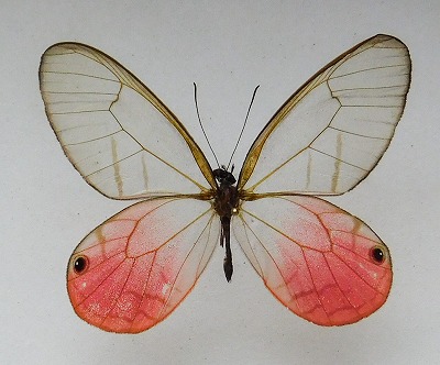 ペルー産 Pisco Nov. 2009 南米の蝶のなかでも透かし羽とピンク色が特徴の可憐な蝶で、特に女性に人気が高い種類です。。 |